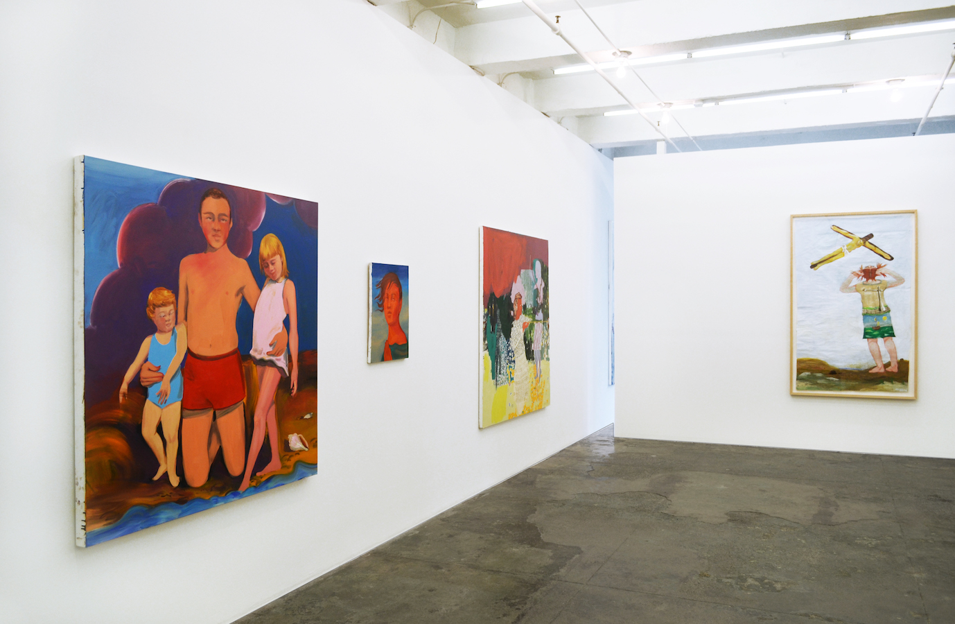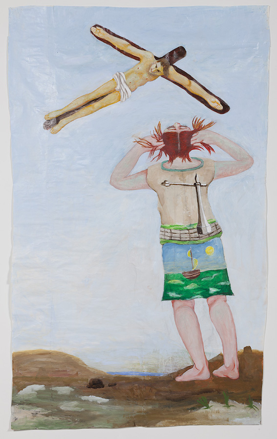 Whereas Staver imbues these archetypes with affection, Charles Garabedian employs myth in a more jarring fashion. The symbolic and mythological references that populate his work are assembled in a disjointed manner, with figures theatrically staged within the picture plane. In the sparsely-set seaside painting Stigmata (2014), Christ appears within a pale sky. A female figure pulls on her own hair as she stares at the cross floating above her. In the pattern of her shirt, the cruciform is replicated as a lamppost, while her position on the shore is mirrored in the seascape of her skirt. These conjoined worlds are idiosyncratic, with deep attention given to figures whose tone and purpose are unknowable.