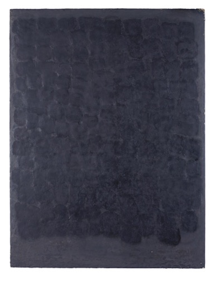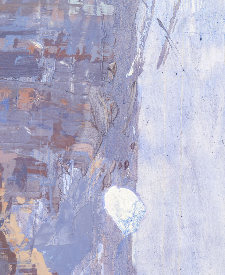 In the Field (2017), a diptych by Hanneline Røgeberg (b. 1963, Oslo), presents two canvases linked by their content as well as by her process. Each work depicts a single site at different points in time, and overlaid on top, the artist paints an additional outline that is impressed from one onto the other. This slippage between images is central to the artist’s work, as there is often political significance to the historical sites she depicts. In enacting a transfer between the two surfaces, Røgeberg treats the images as a form of language or memory code that can be re-used, translated, or taken up by ideology. The partial cover-up of the image reflects this distrust, and the fact that its meanings can be inverted. In another large-scale work, Lede (2015), this haziness is given a more autonomous form, with layers of paint overlapping one another in a washy, though material fog of blues and lavenders.