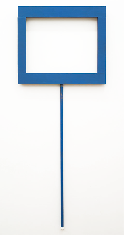 Denzil Hurley (b. 1949, Barbados), in two oil on linen constructions to which poles have been attached, produces paintings that are reduced bare until they point beyond themselves. In Blue Glyph #1 (2011-12), four narrow painted elements are fastened into a rectangular window, each painted a monochromatic blue. An inserted pole hangs downwards, echoing the form of a street sign. The work Yellow Glyph #2 (2016-17) uses a similar format, colored instead with a richly saturated yellow. Despite hinting at the conventions of the monochrome and assembled canvases, the works unite themselves to form frames that privilege the wall behind, and the space underneath. In addition to this frame, their pose suggests signals designed for common usage, treating these glyphs as open messages that can be taken up and carried outwards.