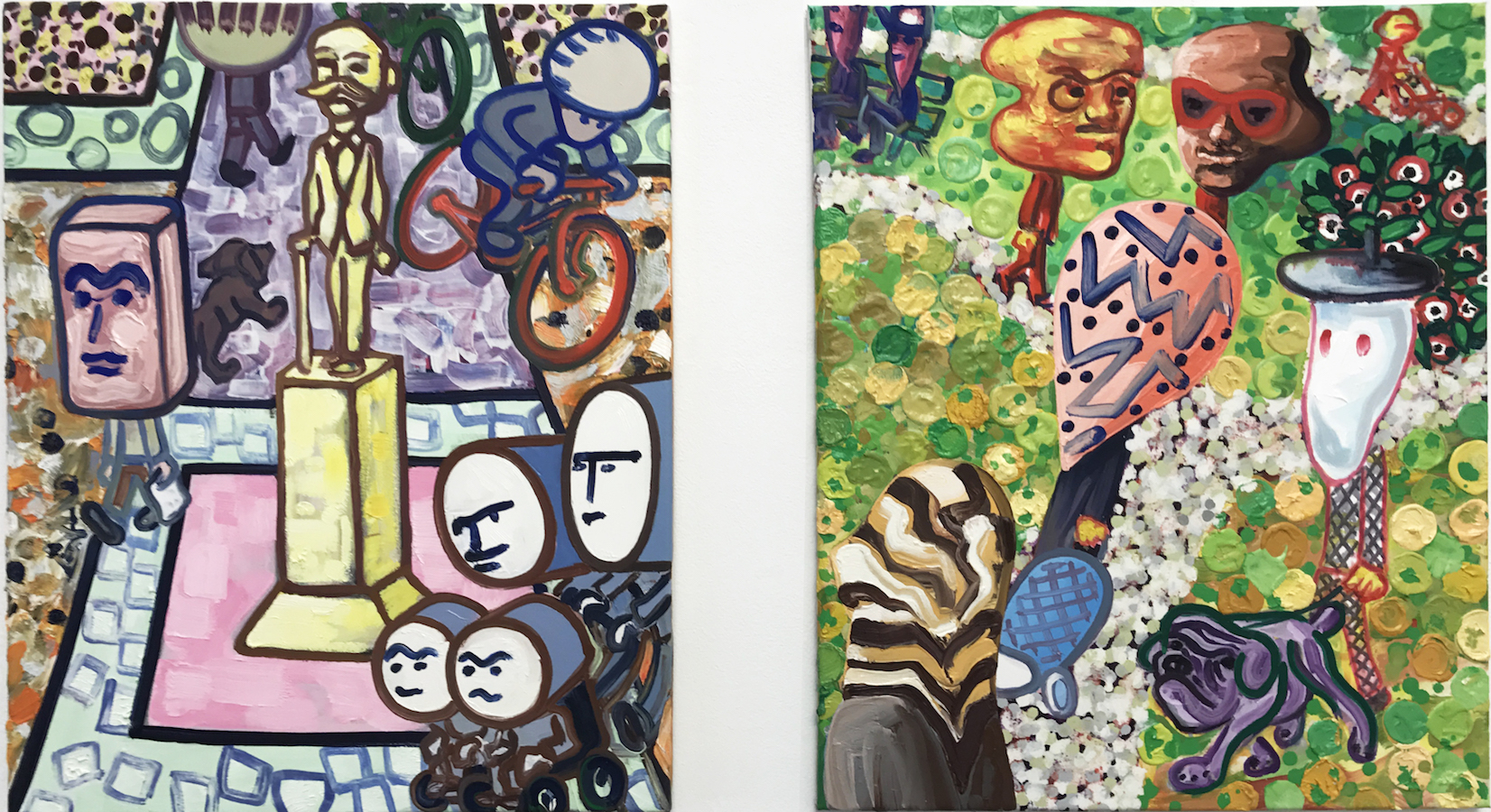 Marcus Weber‘s (b. 1965, Stuttgart) paintings portray urban spaces, focusing on their function as complex, social sites. With their bright color and cartoonish forms, the works show iconic elements of city planning – squares, parks, streets – overtaken by masses of blocky figures. In his heavily applied paints, Weber caricatures various personas, pulling cyclists, women with strollers, birds and dogs as well as joggers into layered, geometric surfaces. The angular compositions emphasize these elaborately patterned forms, drawing attention to the beautifully textured brushwork. The grace of this handling is often in contrast to the subjects themselves, who are often reduced into flat marks, or grotesque lumps. In F-Hain (2010), for example, two walking figures have grotesquely shaped, sculpturally modeled heads that appear impossibly heavy. In the foreground, a ghostly type, wearing the signature cap of an ETA terrorist, is depicted with a pure white face and bright red eyes.