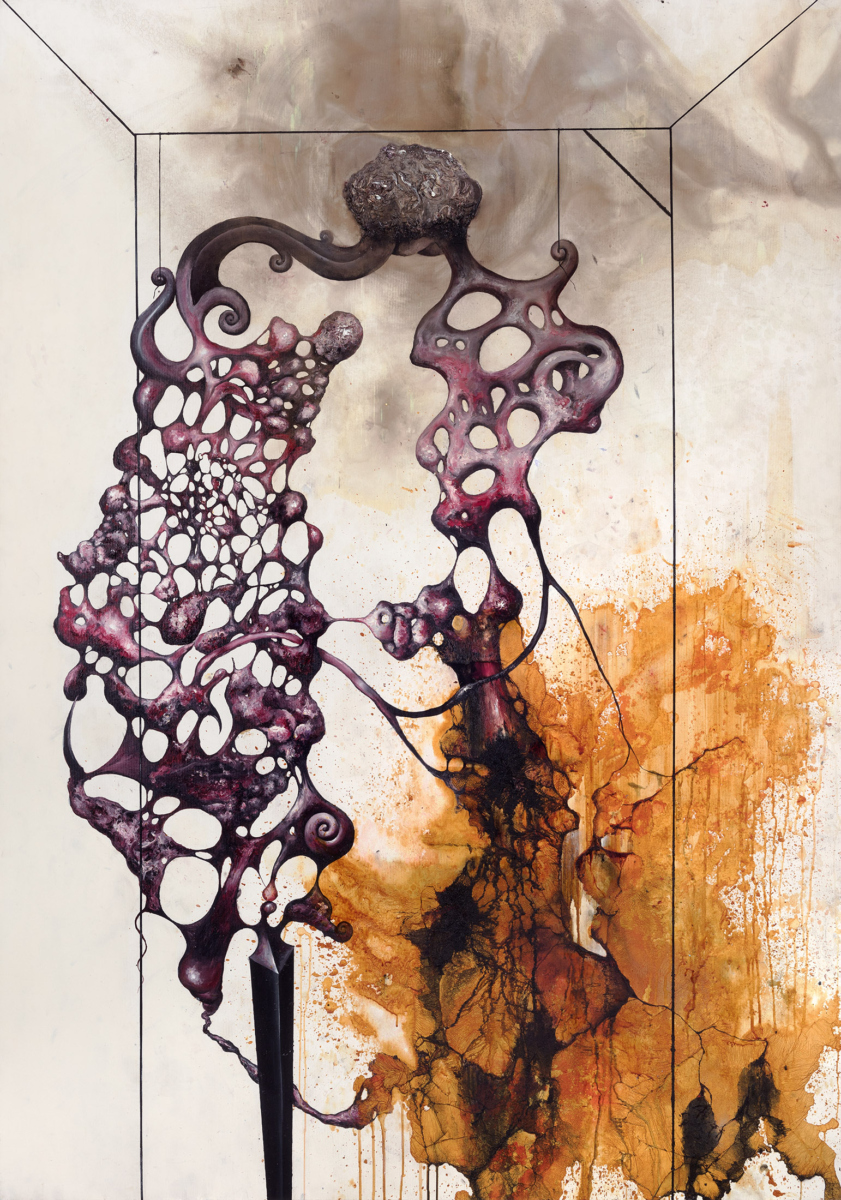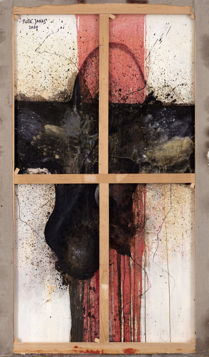 Working in a late-surrealist mode inherited from the Polish avant-garde of the ‘60s and ‘70s, having studied under Prof. Jerzy Tchórzewski, Janas treats the canvas as a body itself, subjecting it to a kind of physical and mental abuse that mirrors the conditions of post-industrial life. Stretched, pierced, corroded, bleeding, the “figures” of Janas’ paintings seem to represent the decayed remains of an earlier form of humanity, which, while no longer living, still contain the trace of a vital will.