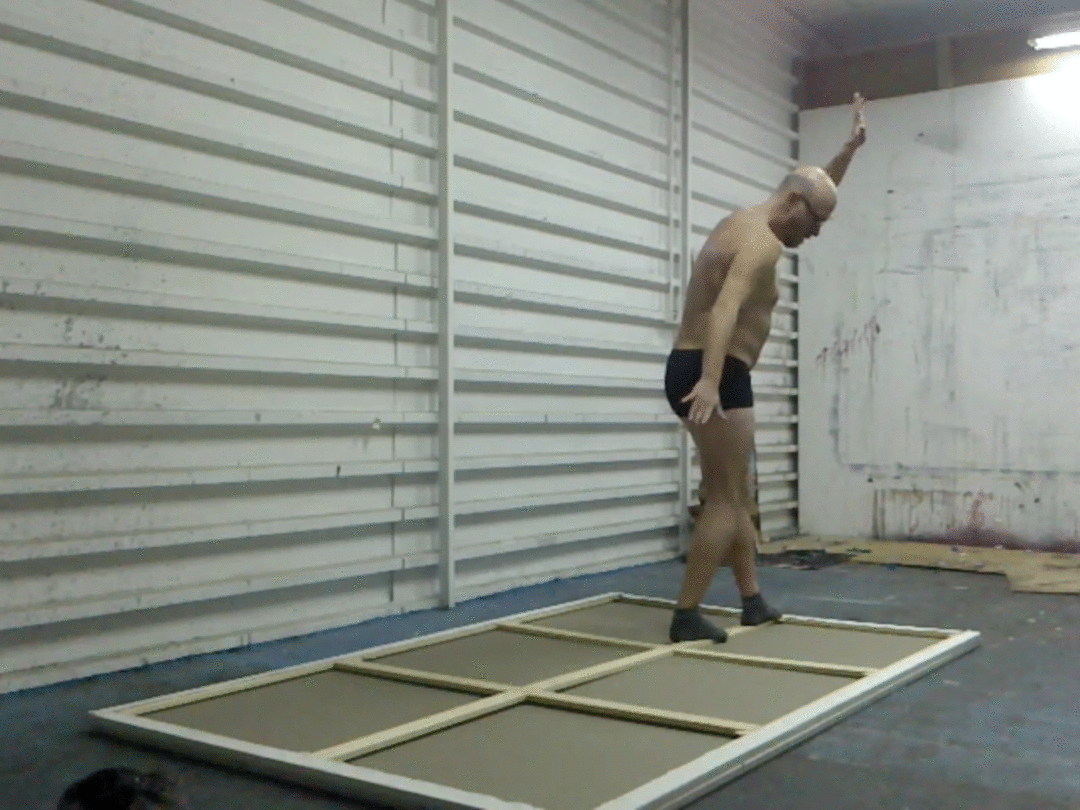 In a video shared by Janas in preparation for the show, the artist — stripped down to his underwear, with cigarette in hand — dances on the back of a painting laid face-down on the studio floor. As he balances on the stretcher, bouncing across the frame striking classical ballet poses, the bars buckle, threatening to crack under Janas’ weight. Like his paintings, the image contains a series of contrasts: the elegance of the music with the awkwardness of his dance; the taut canvas with his soft body; the flat grid with his movement in space. A mutual subjection takes place in which both artist and artwork must submit to the other’s demands.