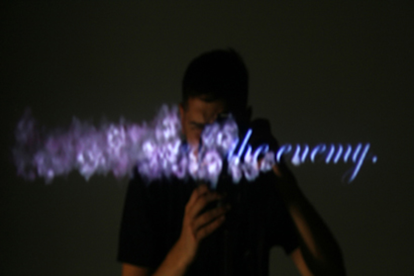 Projected on the back of a double-sided mirror, viewers encounter their own images and naturally fill-in the blanks according to their own biases. Political realities are thereby connected to their individual origins. This piece will be accompanied by hallucinatory footage of the 2005 Billy Graham Crusade, a “found spectacle”, in which the artist edits and effects extreme states of being in a manner that destabilizes the visual field to support a constantly evolving reality.