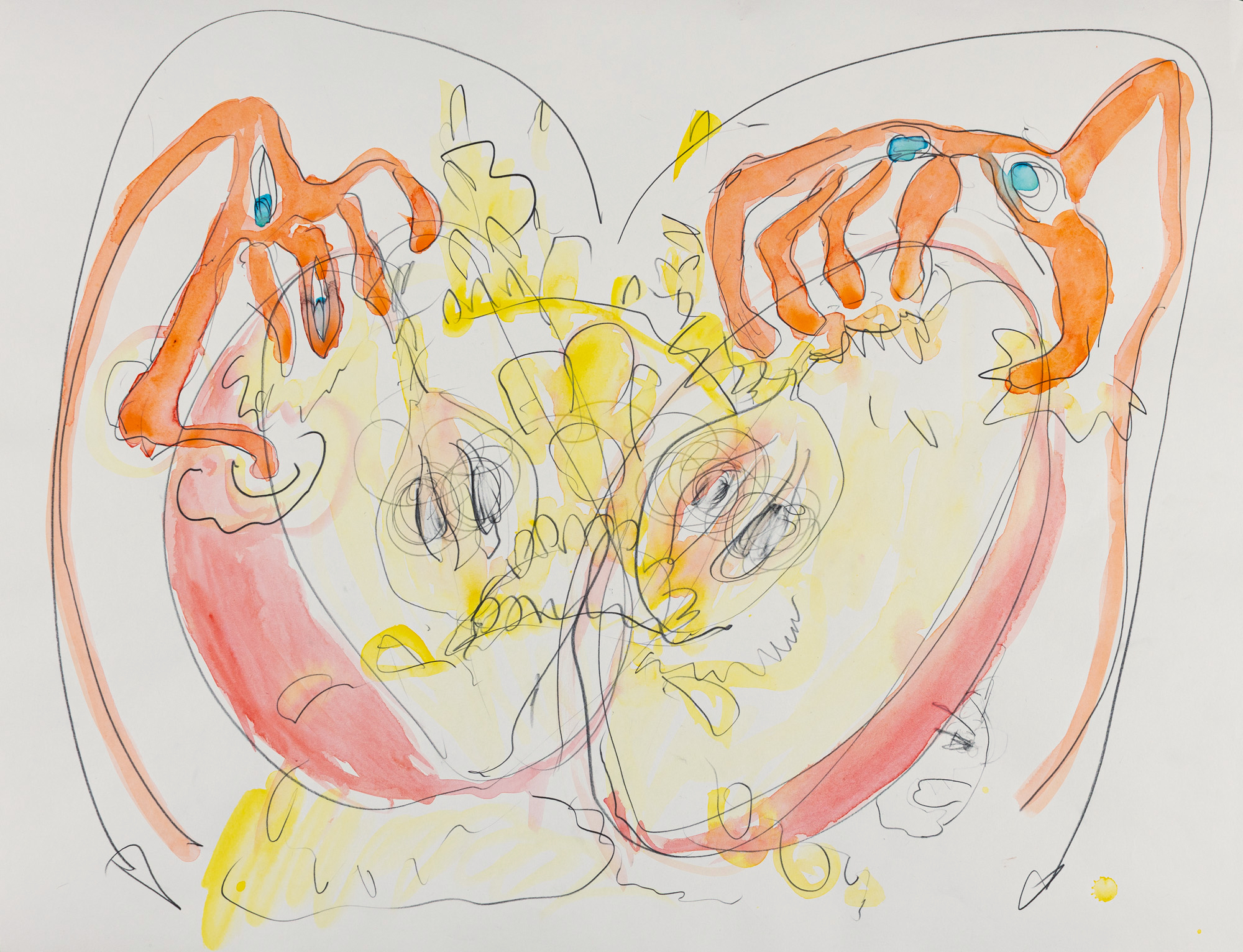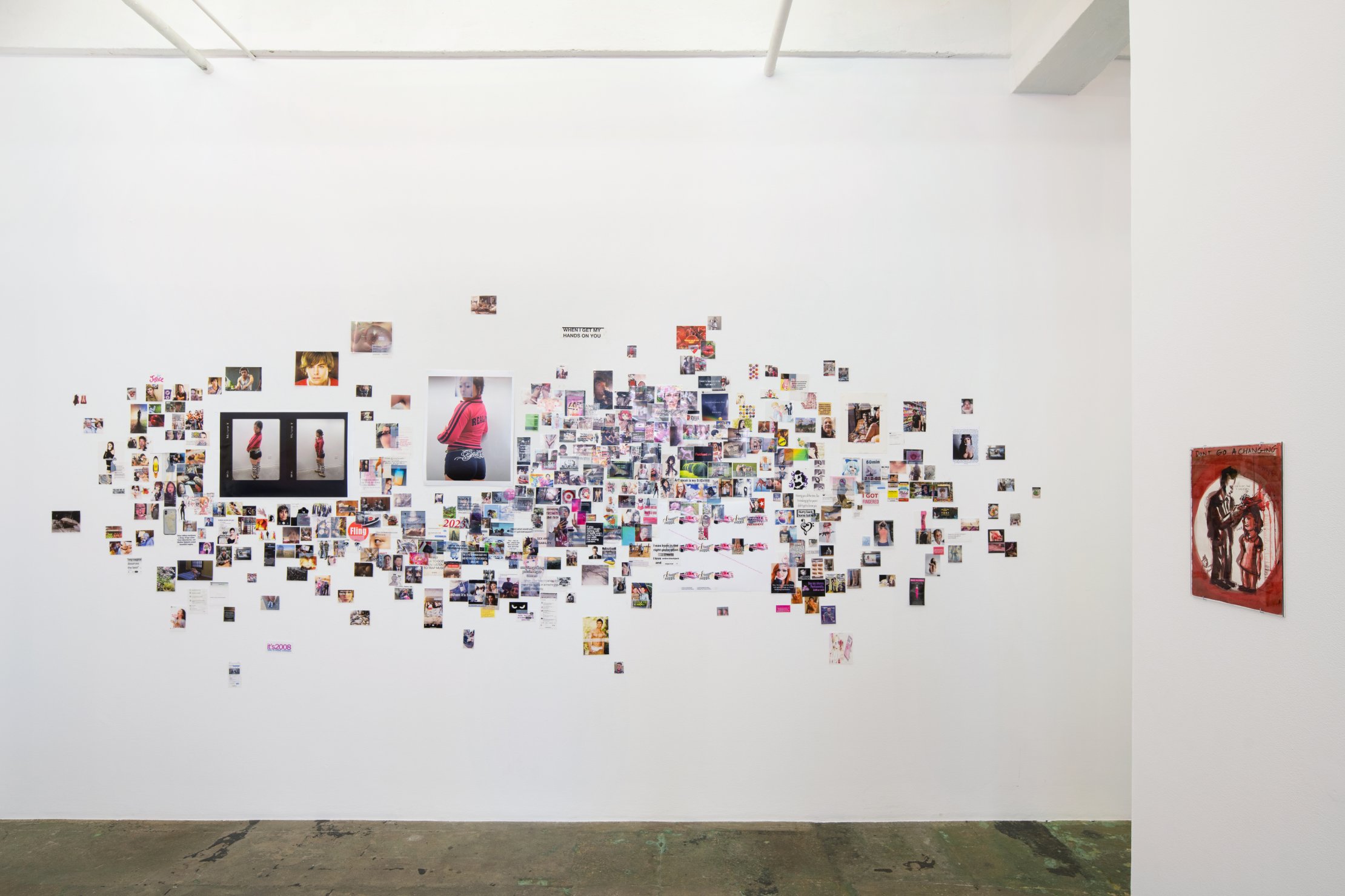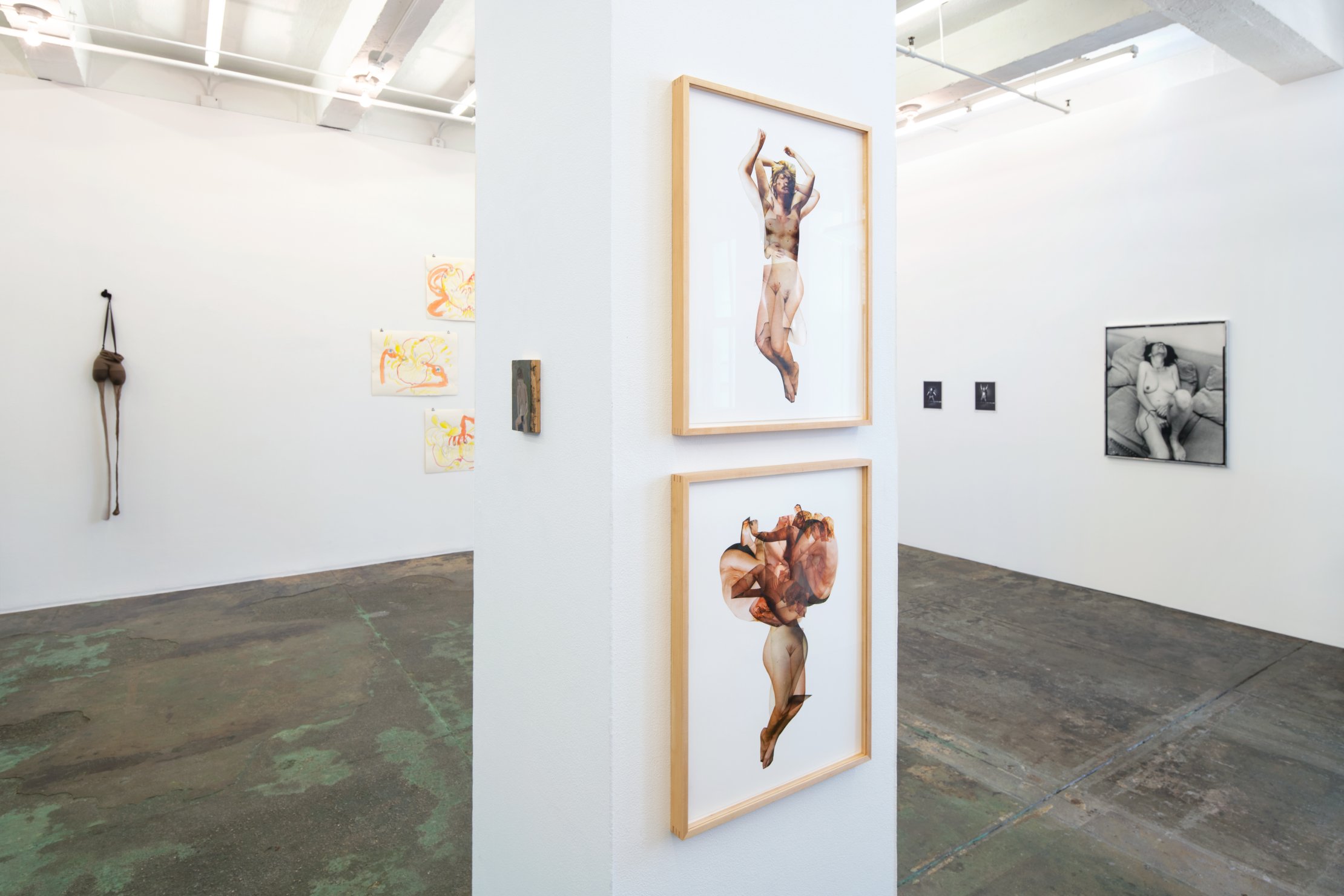 As a counterpoint, Jin Young Lee‘s sprawling installation of self-portraits, screenshots and texts – the result of an exquisite corpse-kind of conversation with her male collaborators – presents aspects of internet culture, where women and the concept of sex become so detached from reality that they occupy an entirely fictitious space. Further poking at misogynistic gender expectations, Nicole Eisenman’s watercolor adds a darkly-comical coming-of-age story.