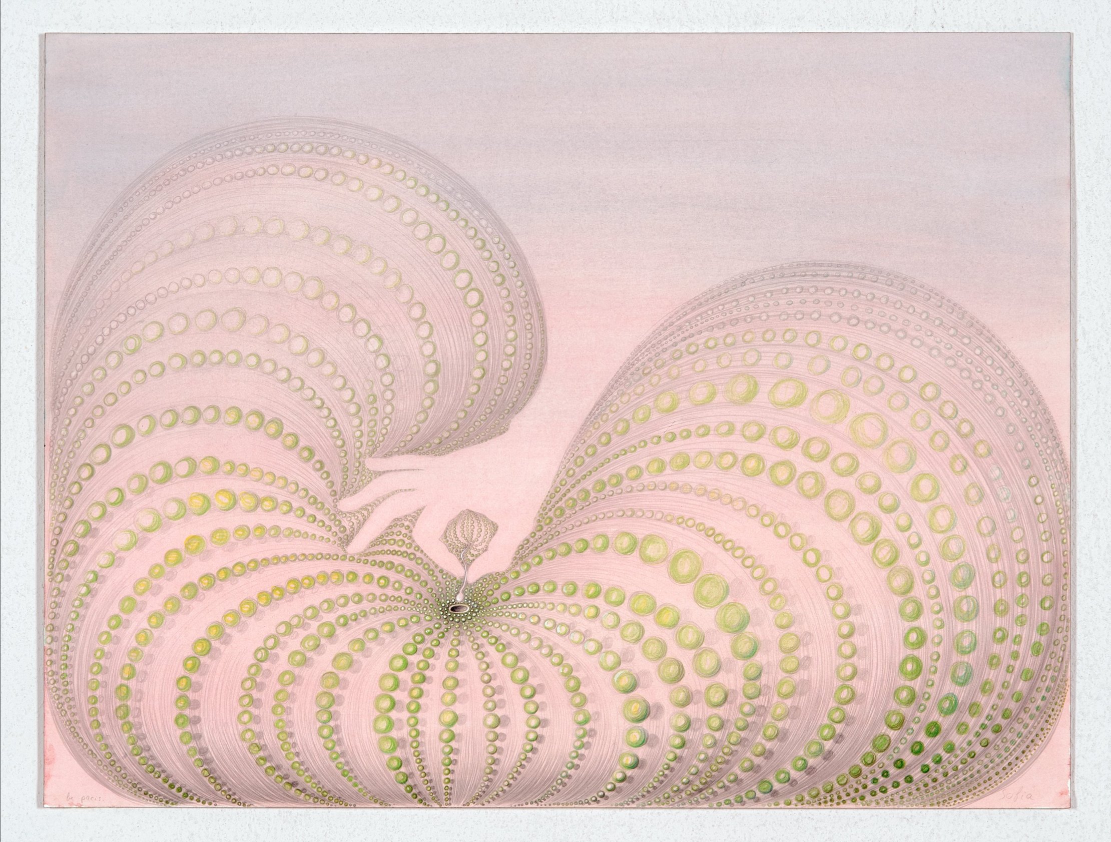 Subtly, and emerging as a result of a painterly process starting from 19th century erotica, we see a female figure suggestively touching herself in Janice Nowinski’s intimate painting. The same gesture is pointed to in Kinke Kooi’s pastel Precise, and becomes an unidentifiable “act of pleasure, an act of protection or an act of comfort to soothe a supposed pain or injury” in Shala Miller’s work.