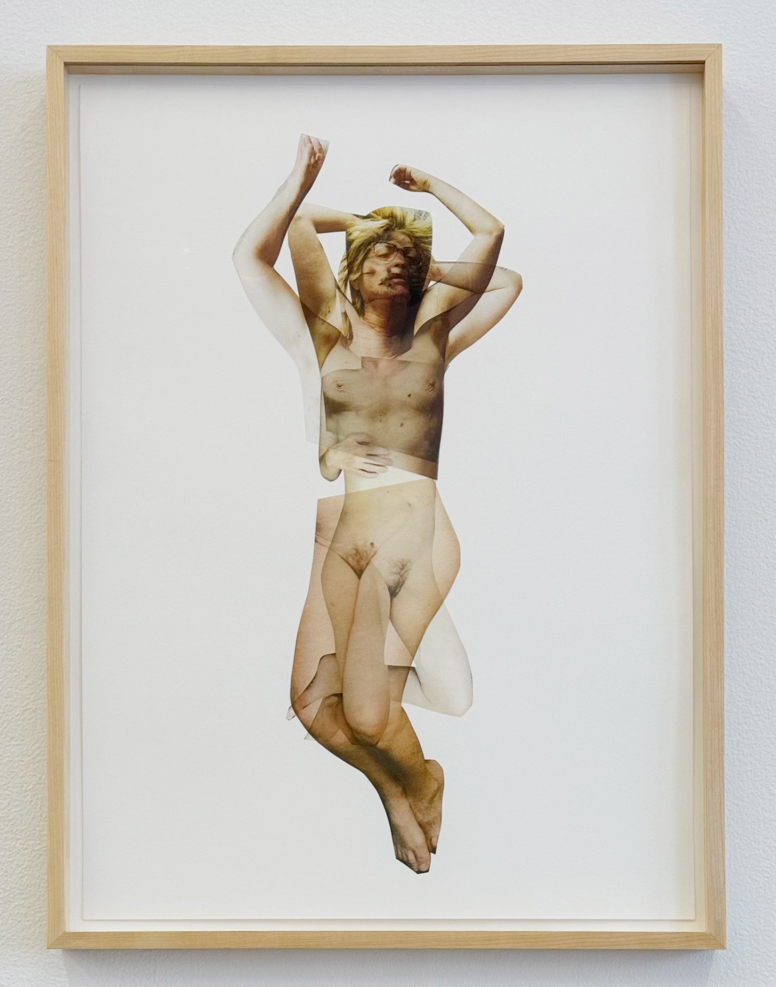 “Male energies”, humorously referenced in Senga Nengudi’s nylon mesh sculpture, are present in her sand-filled bulbous forms, which simultaneously suggest pendulous breasts and testicles. And, gender fluidity as well as entwinement are the subject of Jacky Marshall’s collages, in which her and her partner’s (in male drag) nude portraits are printed on transparent film, intermingling materially as well as visually. In Tofo Bardi’s paintings, by contrast, genderless beings float ethereally in a space defined solely by color.