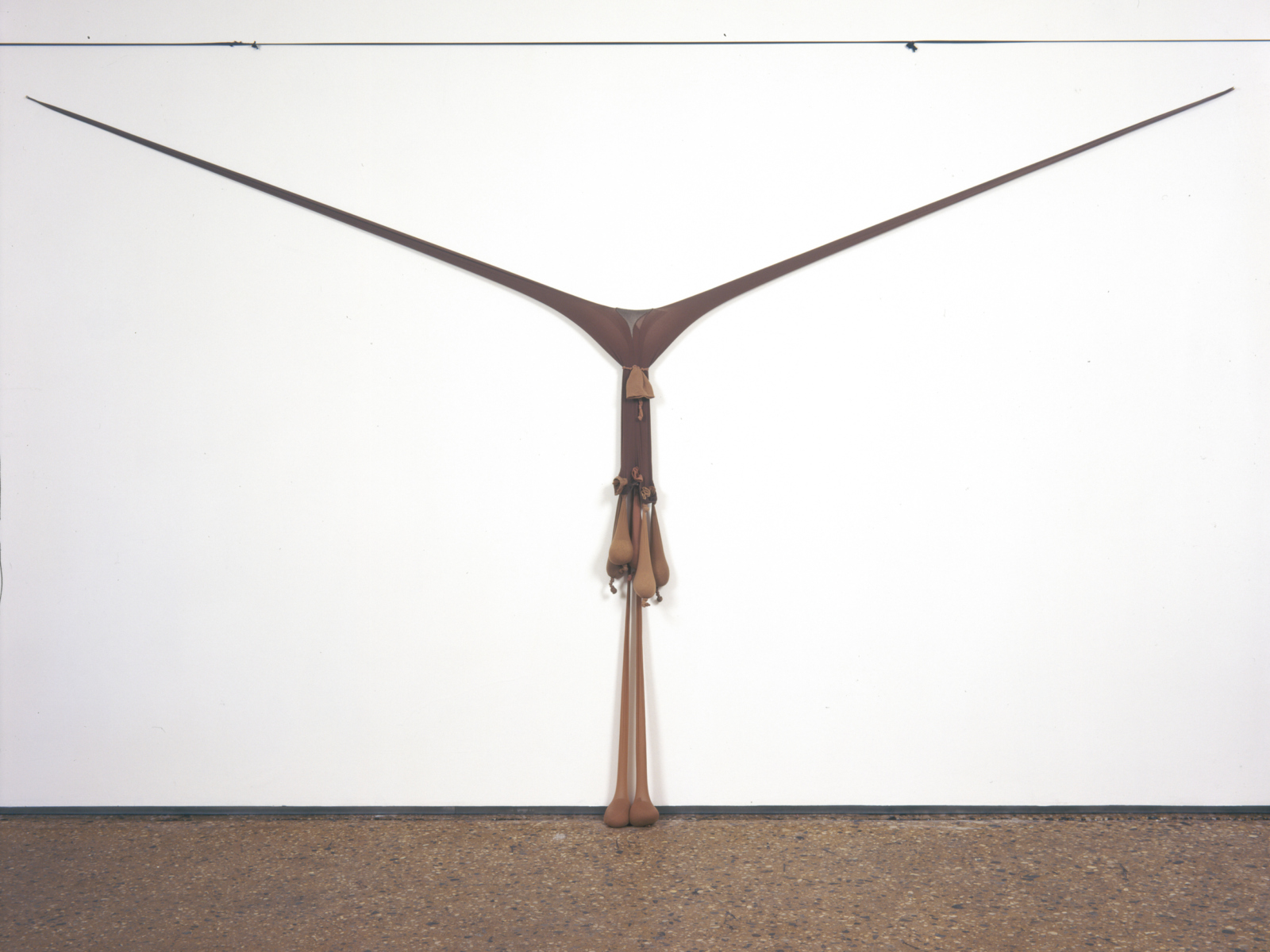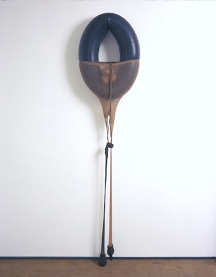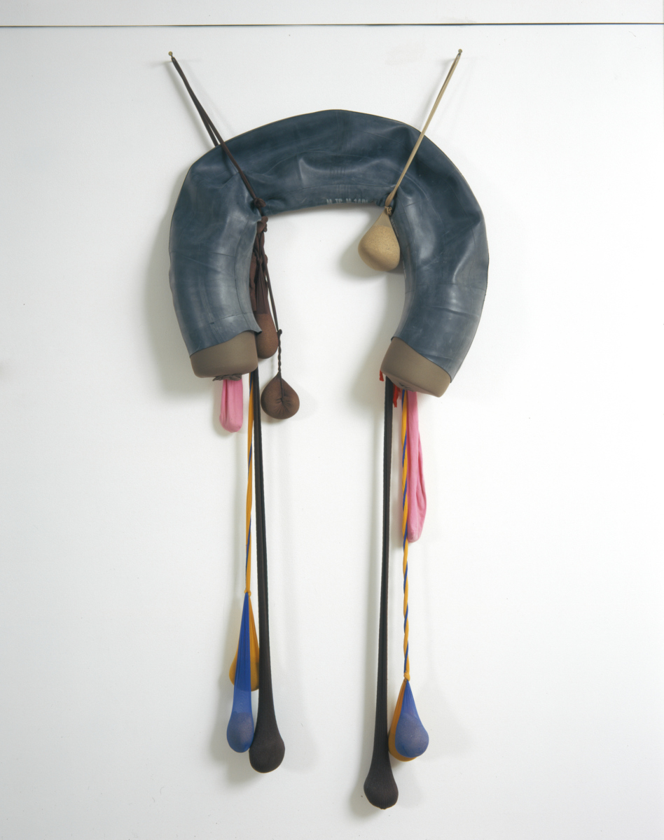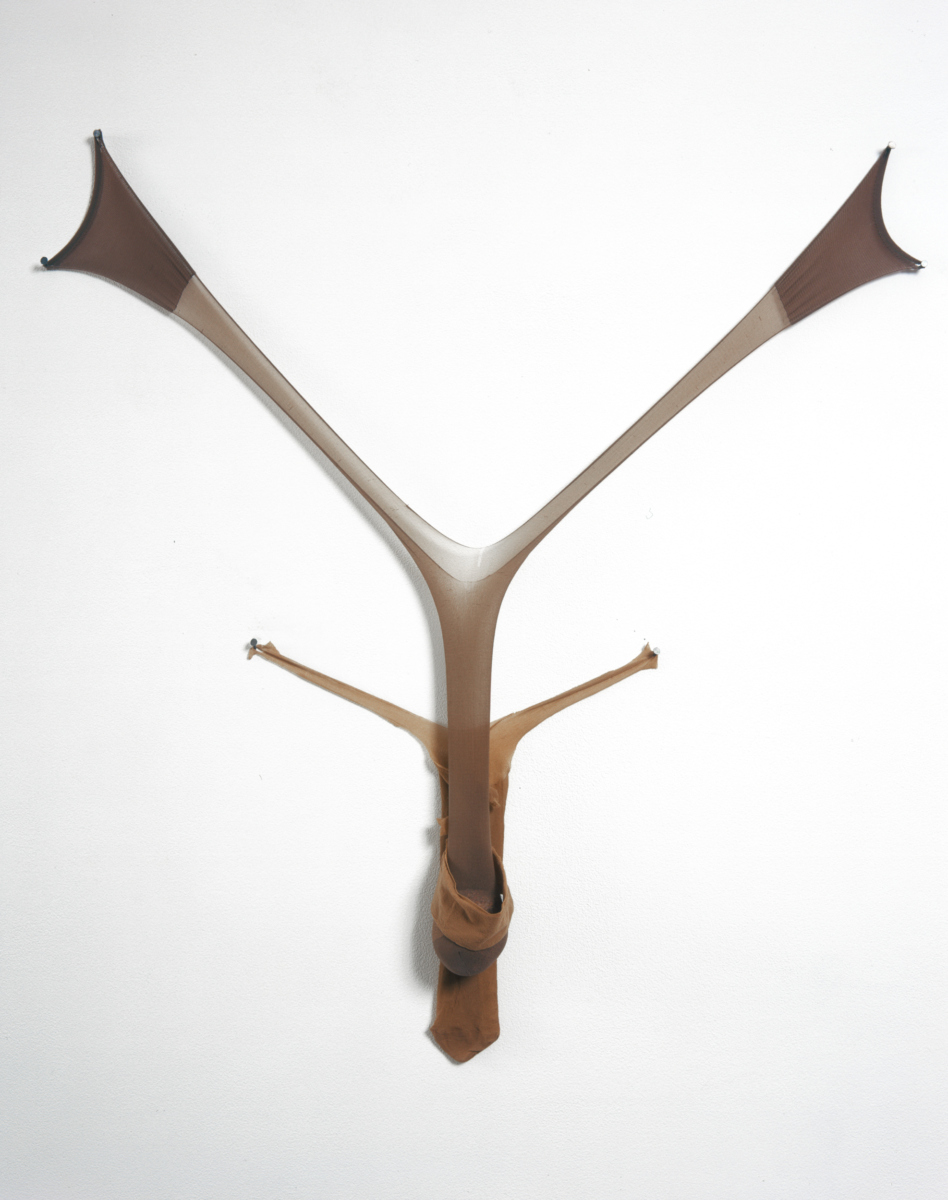 The wall piece sculptures and installations on view are made of previously worn panty hose, some of which are brightly colored. They are filled with sand, stretched in space and are sometimes combined with found rubber or metal pieces.