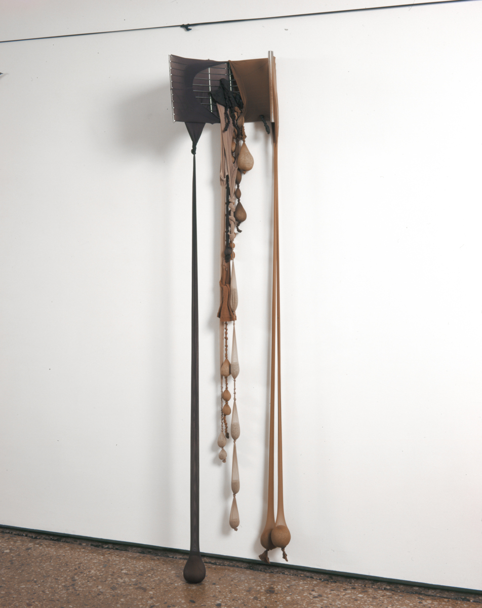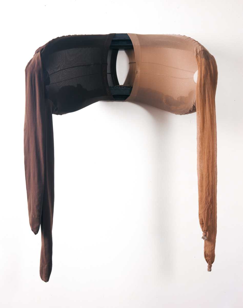 Nengudi refers to them as “abstracted reflections of used bodies – visual images that serve my aesthetic decisions as well as my ideas.” She further states: “I am working with nylon mesh because it relates to the elasticity of the human body – from tender, tight beginnings to sagging end. The body can only stand so much push and pull until it gives way, never to resume its original shape. After giving birth to my own son, I thought of black wet-nurses suckling child after child – their own as well as those of others – until their breasts rested on their knees, their energies drained.”