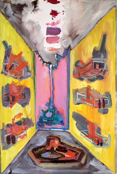 Playing impasto against splattered veils and contrasting urban colors with a new age palette, these works distort material flatness into a warped spatiality and combine figuration with abstract symbols and uninhibited brushwork, holding together a spectrum of sensibilities that precipitates early American modernism into an apocalyptic, prophetic hyperbole and personal vision.