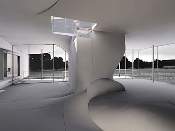 The overriding idea uniting the different projects is that of a torus, a donut shaped figure, in which the outside traverses the center reversing the familiar relation between inside and outside. Thus, for example, the core of the Torus House contains a stair allowing one to pass from a parking platform below the house directly unto the roof without entering the inside.