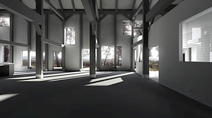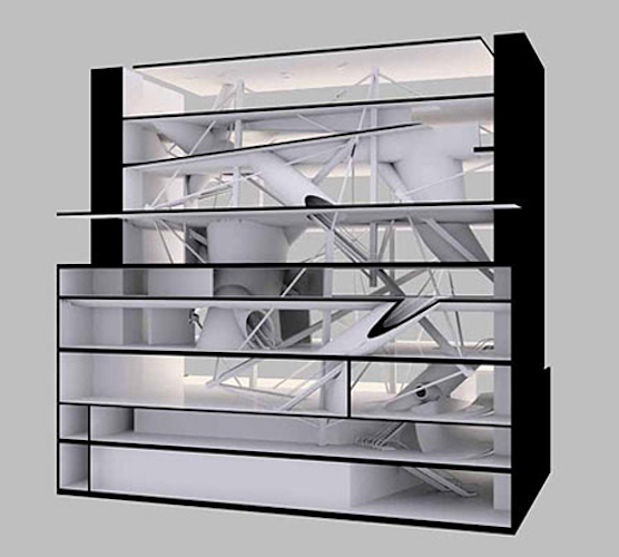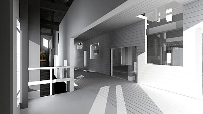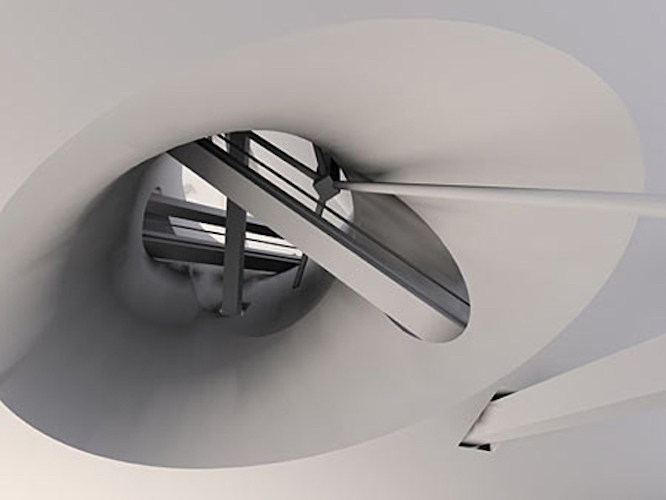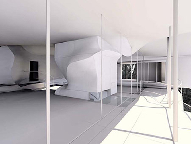In Cohen’s second stage competition entry for Eyebeam Atelier’s Museum of Art and Technology, New York, 2001, the toroidal space takes the shape of cones and cylinders intersecting one another. The resulting sensuous curves animate the otherwise minimal building and illicit biomorphic and maritime associations. The Goodman House, a relocated 18th century barn structure, is enveloped in a structural steel case which in turn is housed in a third skin which penetrates the voluminous interior in a toroidal manner.