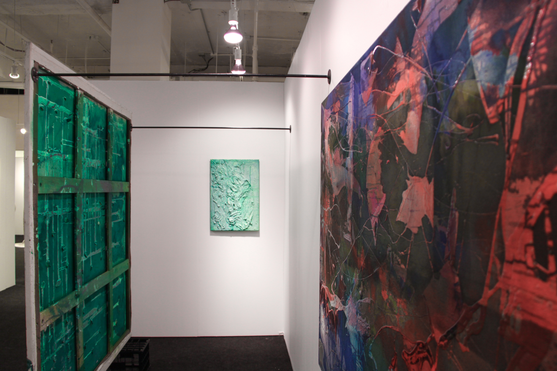 The focal point of Dona Nelson’s solo presentation at VOLTA will be “O K”, a two sided painting of delicate ridges of frosting white on the front and dense green, cut with spills of white paint, on the back. OK, according to Wikipedia, is “a grammatical particle which does not modify any other particular word, but rather reinforces the general point being made, particularly if that point is being called into question.” OK is a sound or an exclamation or an interjection that stands alone, but if one separates O from K, the meaning (the affirmation or whatever) disappears. The letter O cannot be separated from the letter K; however, the two letters look completely different from one another, like the two sides of her painting, “O K.”