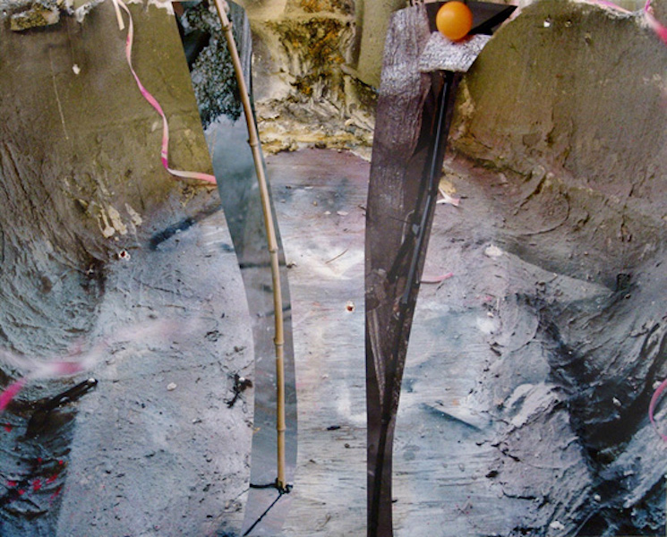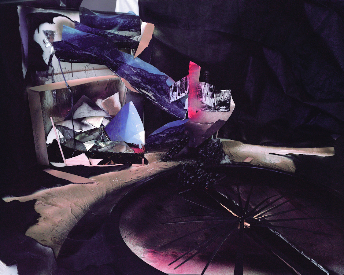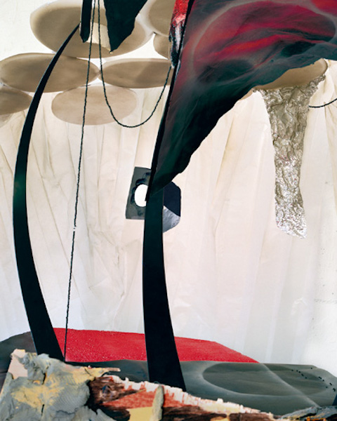 In this new body of work, Nayar enables us – through an increase in scale – to more directly inhabit her photographs, documents of temporarily fashioned tabletop sculptures and environments. A slow-down of the photographic moment is effected through the entirely hand-made nature of her assemblages, which are additionally inscribed with time through a process of continuous reworking. The textures of raw, often discarded materials (plaster, Styrofoam, plastics, fabric, etc.) complemented with the flattening and distancing qualities of photography result in works that are structured, yet highly visceral. In her constructions, Nayar often uses historical imagery as a point of departure and employs familiar spatial logic to engage levels of recognition, while simultaneously suspending narrative and defying rules of perspective. These tensions, combined with her painterly sense of color and use of light, create an elusive, open-ended quality.