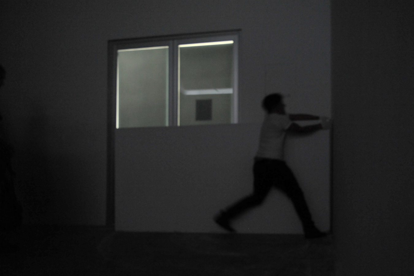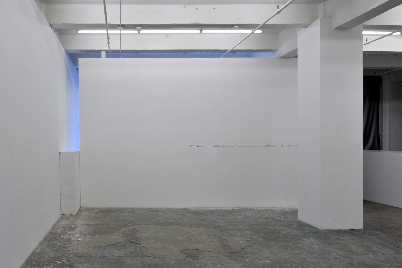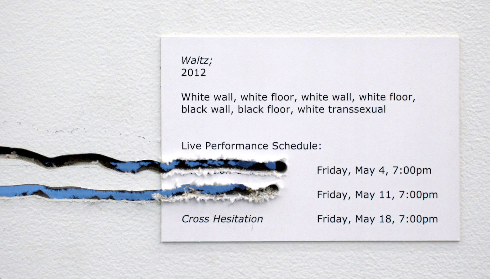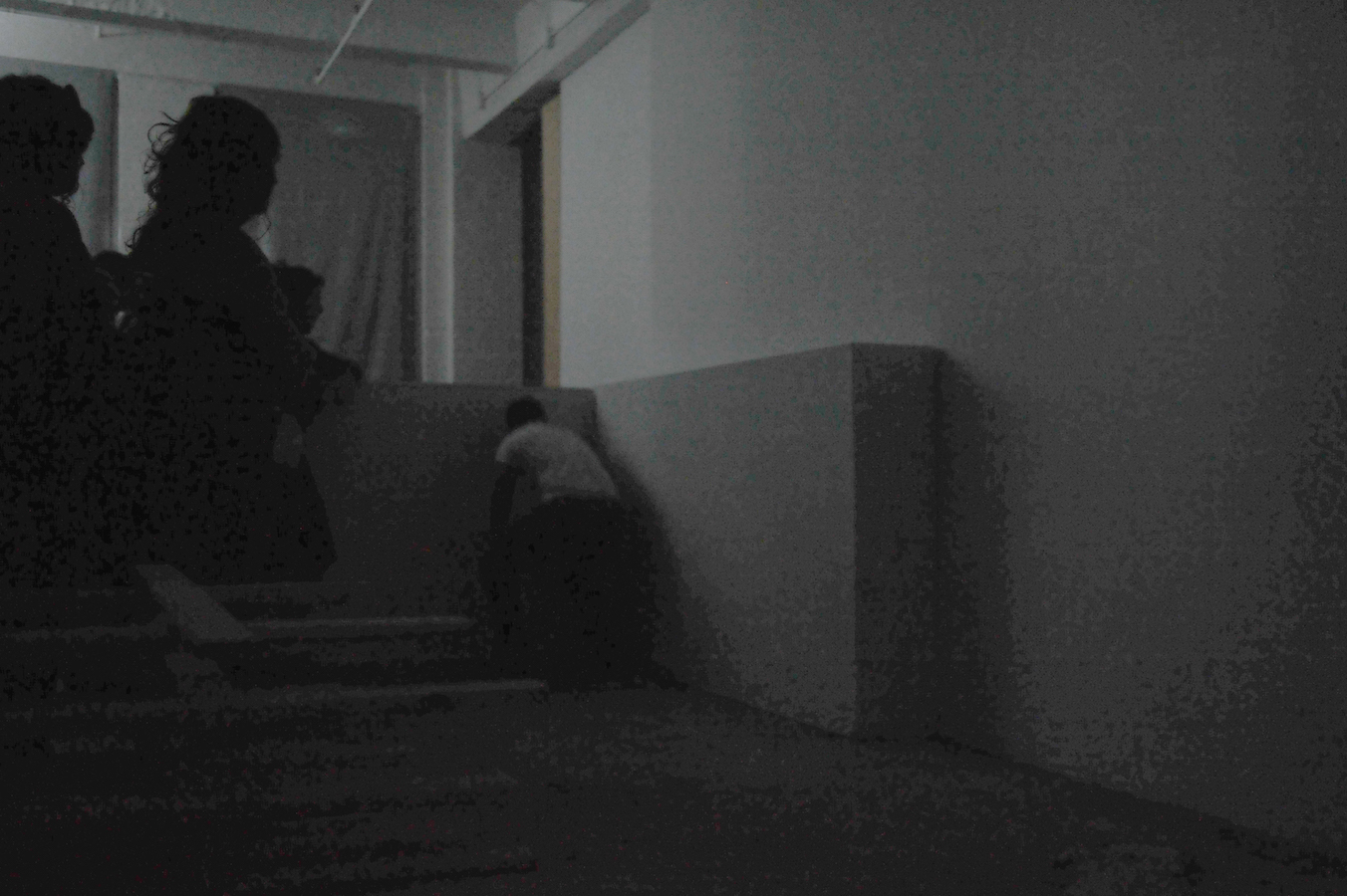In the darkened gallery, the audience first observes the artist in a walled-off area, by way of a limited access view through a horizontal slit cut into the wall. The wall-mounted sprung dance floor from Coda, which Laris Cohen presented recently at SculptureCenter, is stacked horizontally in a corner. A slab of white wall blocks the enclosed area in which he prepares the surface of an identical second one, a process involving an extended sequence of ballet jumps. One of the walls makes a journey along the perimeter of the gallery, leaving scratch marks that – together with other accumulating residue – create the exhibition. The organization of each performance varies slightly, reflecting Waltz;’s three discrete titles.