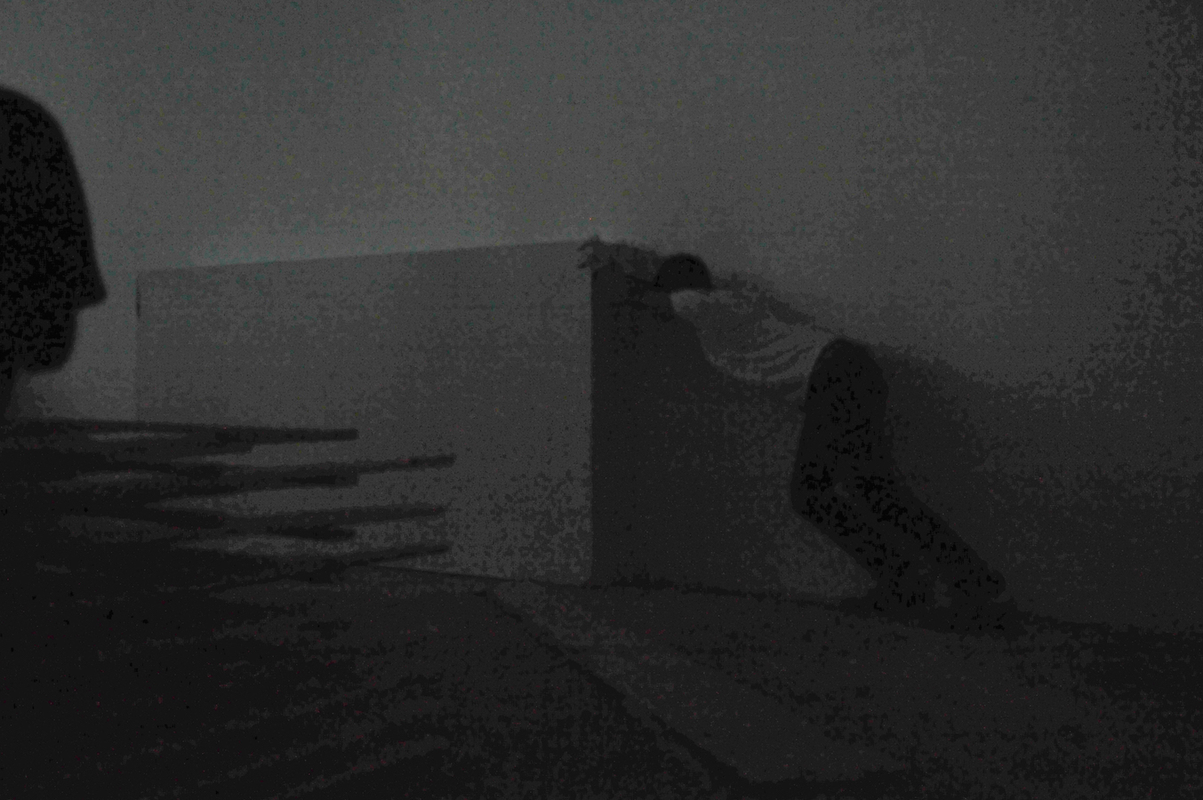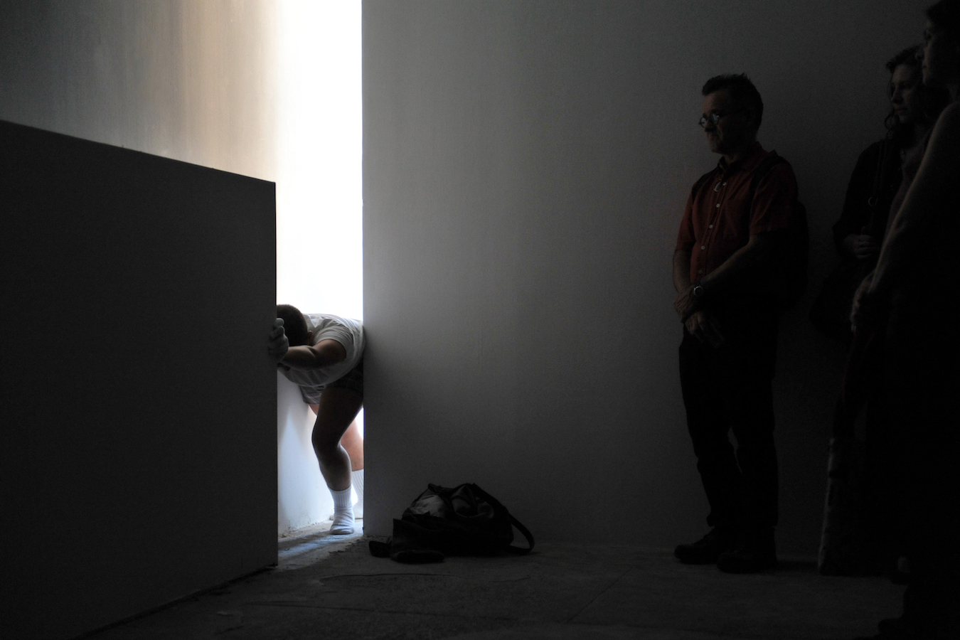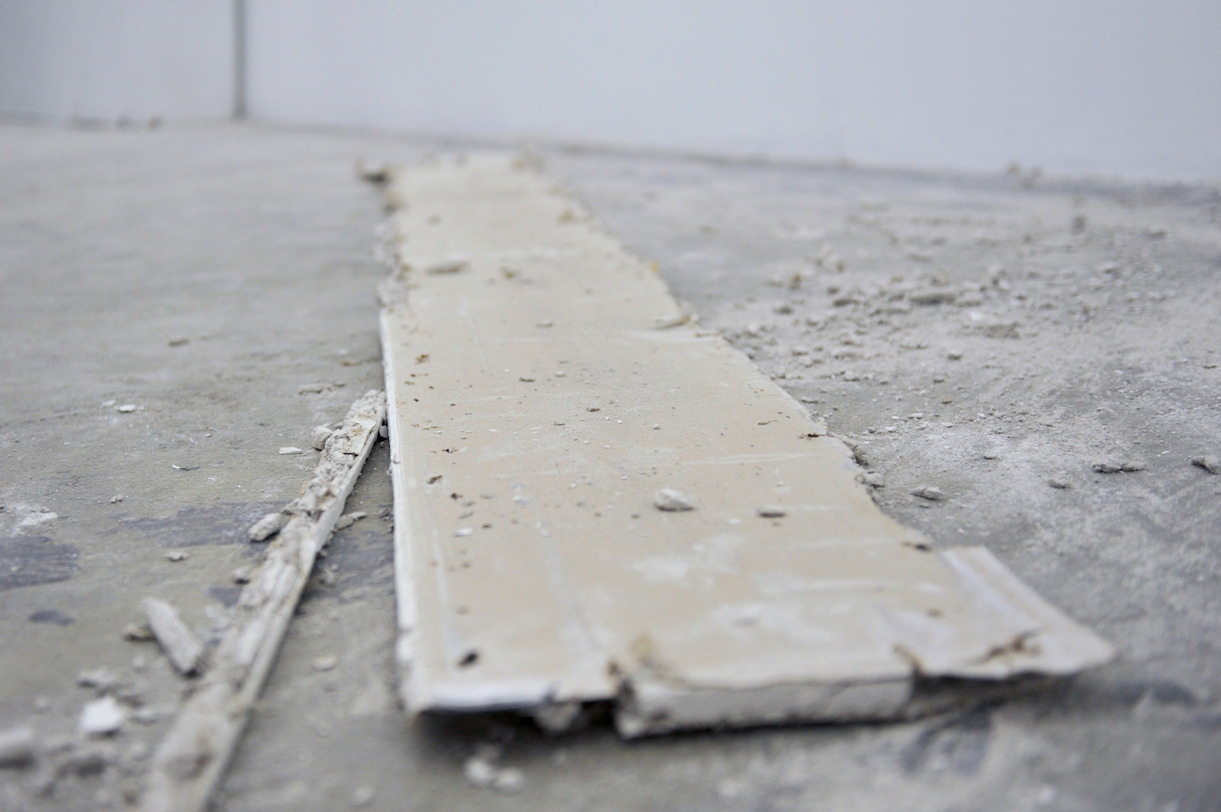 In the darkened gallery, the audience first observes the artist in a walled-off area, by way of a limited access view through a horizontal slit cut into the wall. The wall-mounted sprung dance floor from Coda, which Laris Cohen presented recently at SculptureCenter, is stacked horizontally in a corner. A slab of white wall blocks the enclosed area in which he prepares the surface of an identical second one, a process involving an extended sequence of ballet jumps. One of the walls makes a journey along the perimeter of the gallery, leaving scratch marks that – together with other accumulating residue – create the exhibition. The organization of each performance varies slightly, reflecting Waltz;’s three discrete titles.
