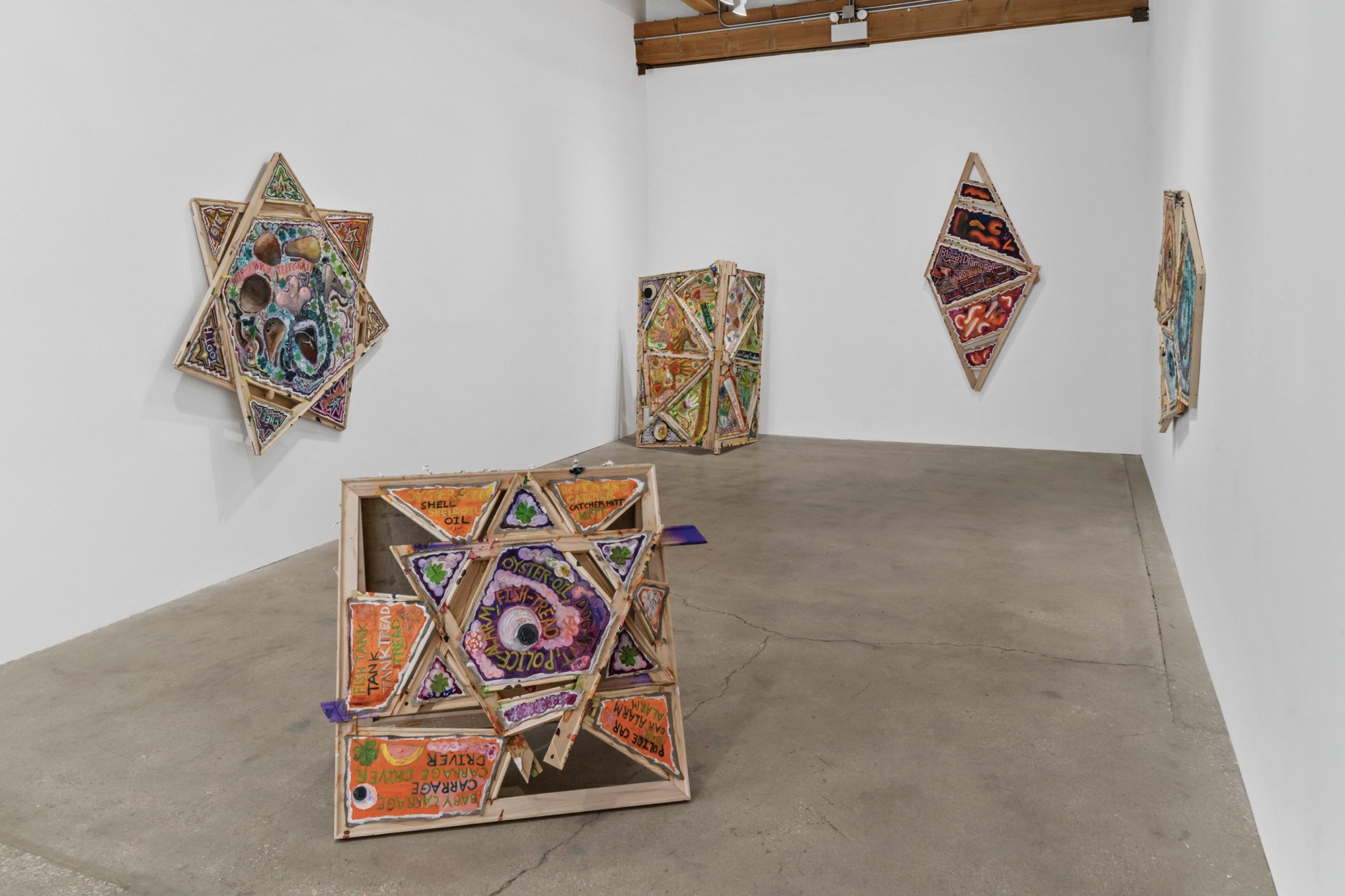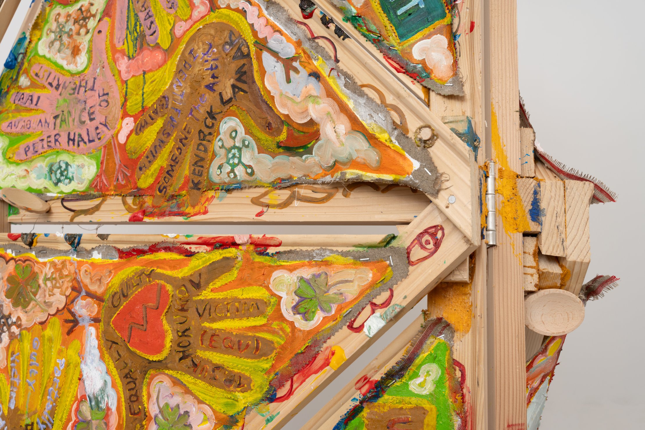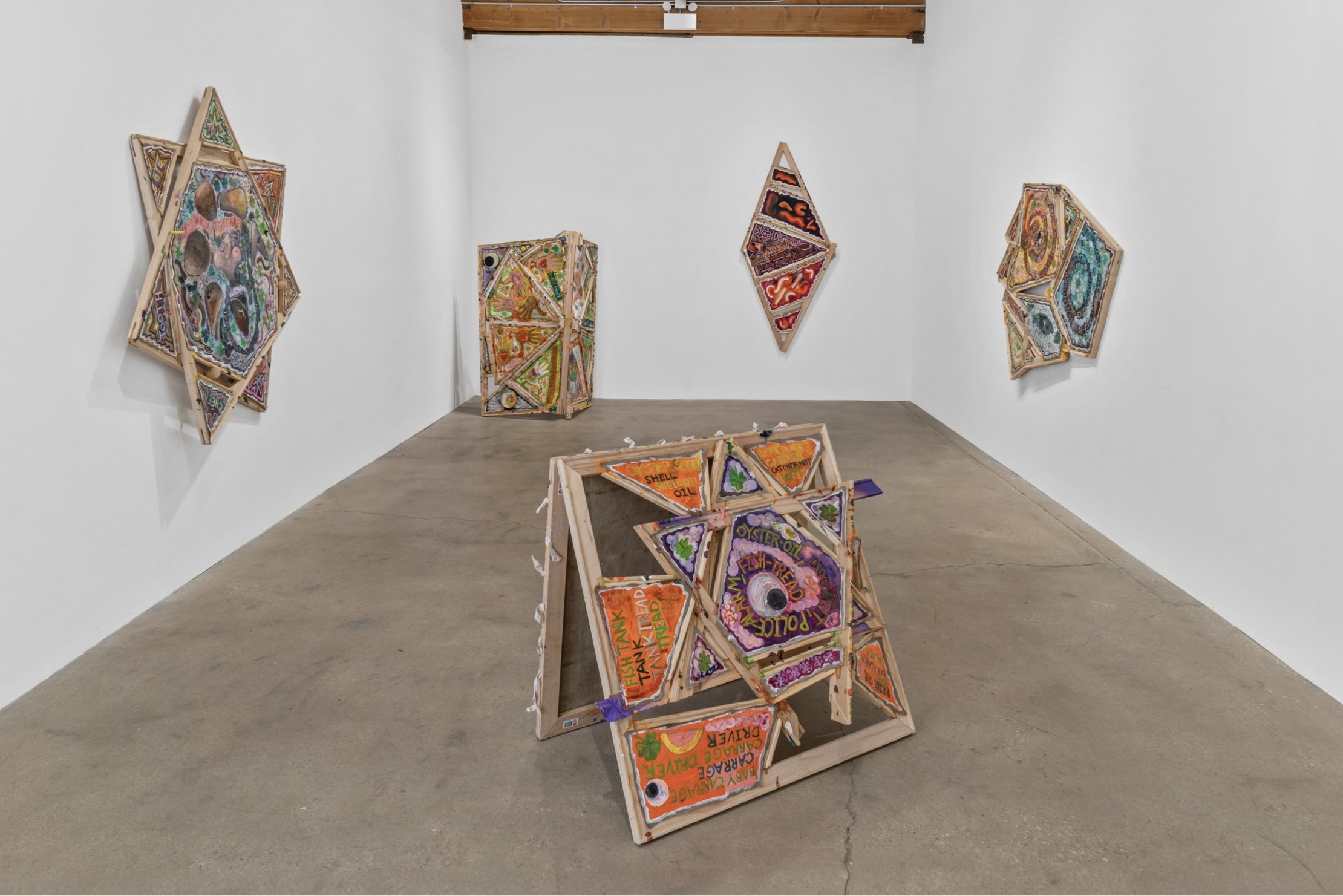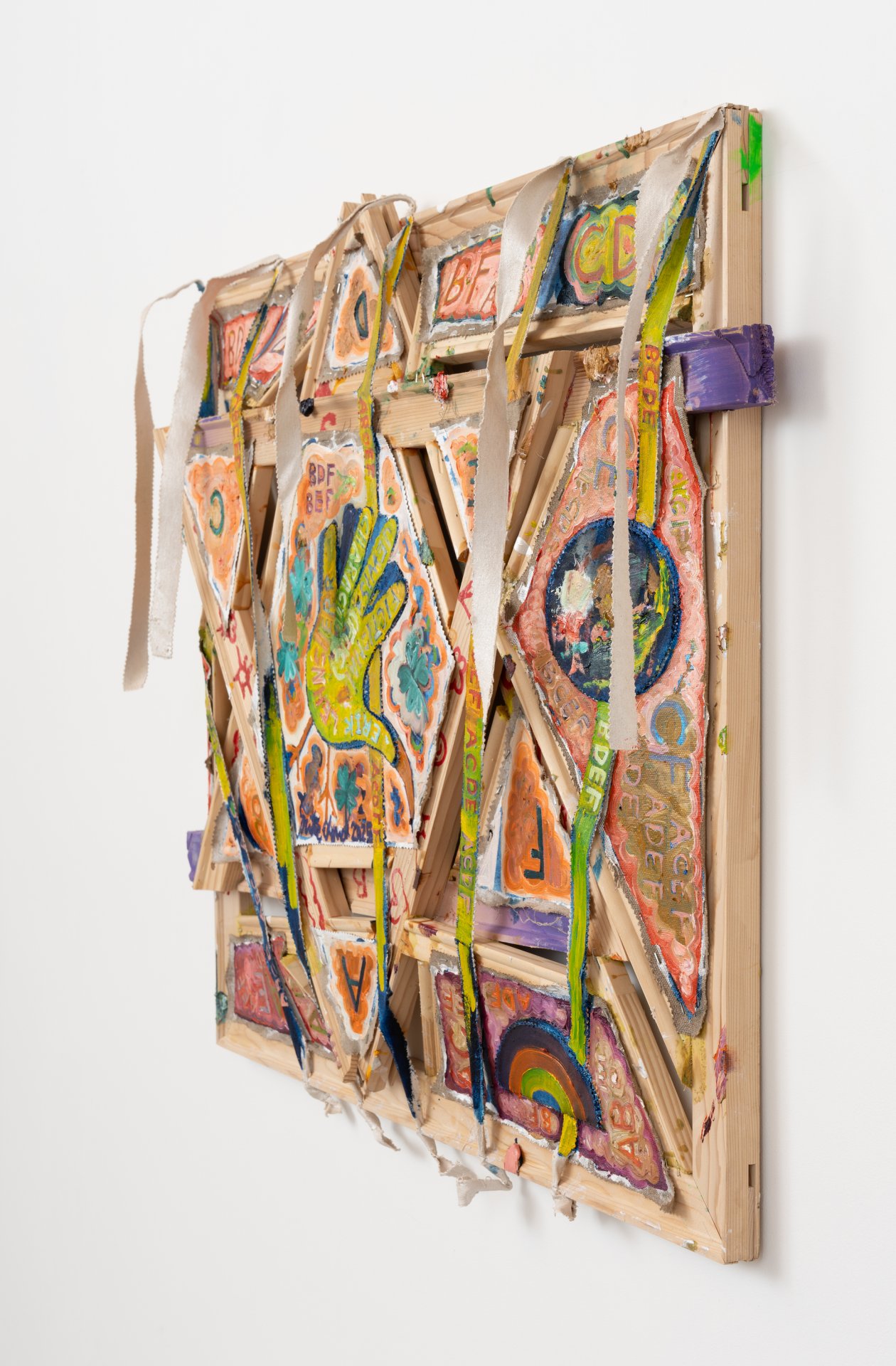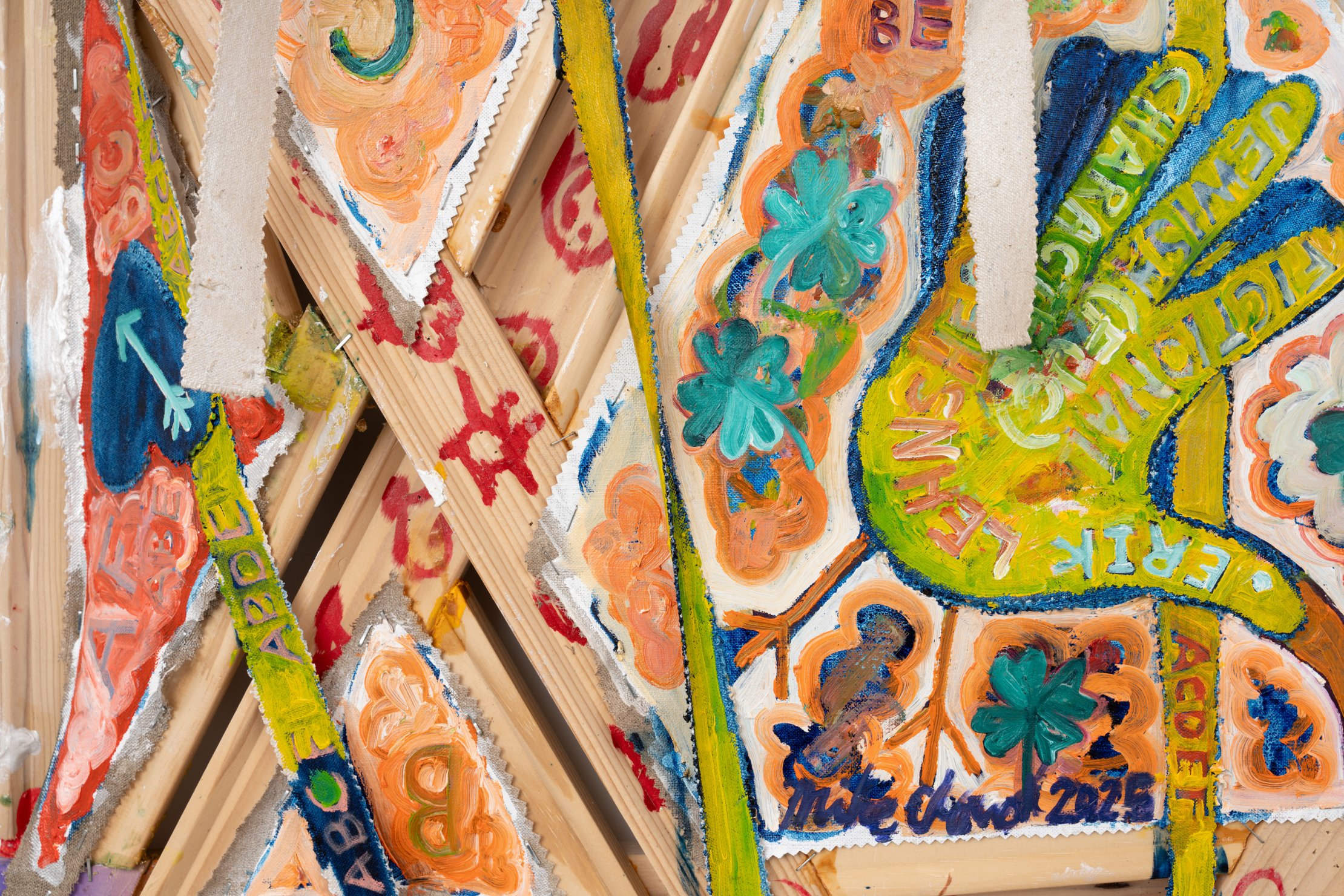 Mike Cloud (b. 1974) is a Chicago-based artist whose complex and vibrant paintings often utilize conventional support materials organized in unconventional ways. Stretcher bars, normally brought together at perpendicular angles, are instead conjoined into star or diamond shapes, one sometimes crossing in front of another like a highway offramp; canvas may be affixed to the front of the bar, rather than stretched around it, and thin strips of canvas might cross the field like streamers or banners. Are Cloud’s paintings abstract? This is a complicated question to address. Are they representational? Yes, they represent specific and concrete things in the world – people, places, objects. Do they represent these things through visual likeness? Not so much. Instead, Cloud invokes other forms of semiosis, producing meanings through a variety of means – written language, linguistic permutations, website urls, hieroglyphs, pictograms, and other symbolic imagery such as hand-birds. Again, are they abstract? Yes, Cloud’s paintings are abstract in the sense that they condense vast amounts of information into a limited space. In the new works presented in Circle Chat, Cloud has included two canvases that utilize hinges to fold into floor sculptures, one hinged horizontally like a construction site sign (“Oyster Oil”), the other hinged vertically, sitting on the floor like a scrim (“Kingdom of Luang Phrabang”). Highly specific, yet mysterious and spring-loaded, these virtuosic, operatic works are ultimately meditations on the fundaments of painting – color, facture, form, speed – and the relationship between the act of interpretation and being in the world.