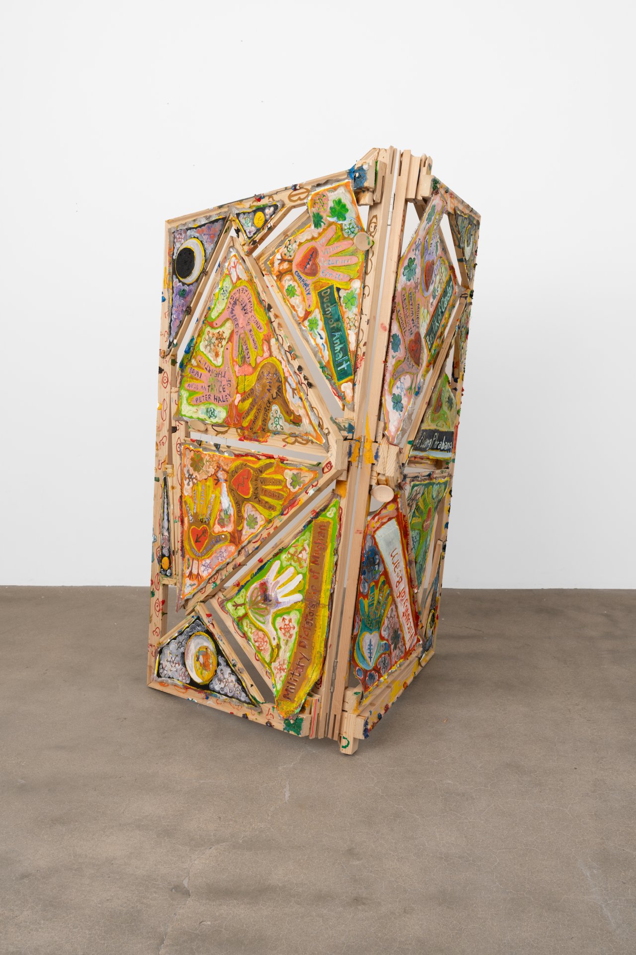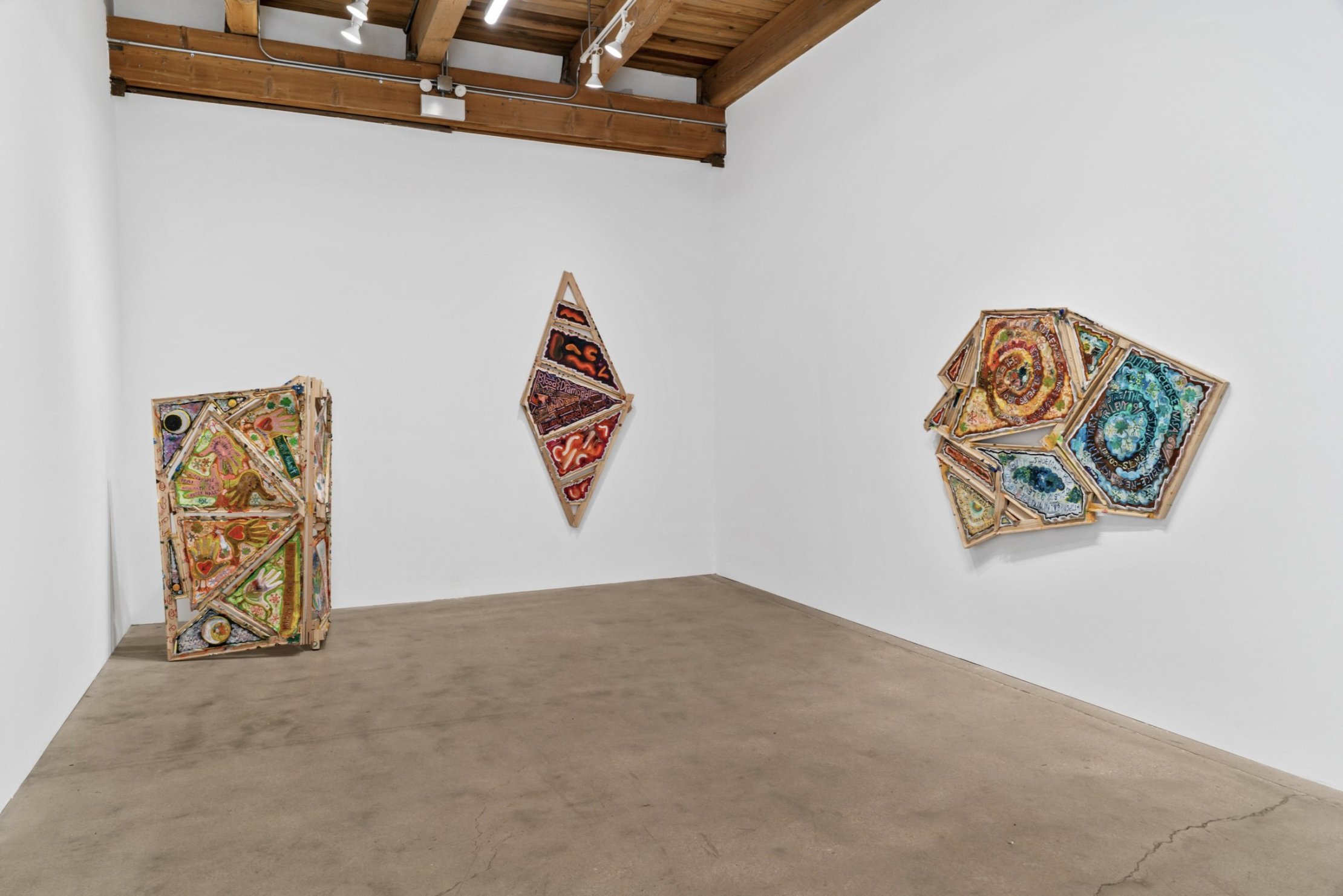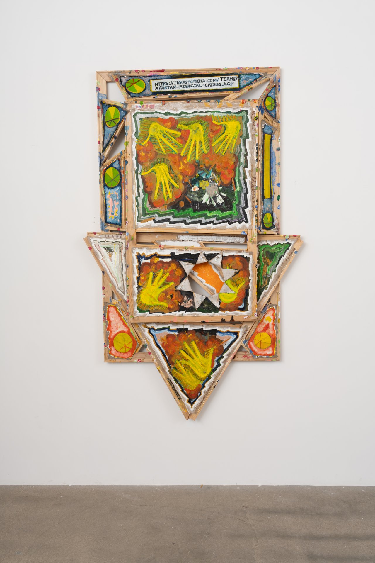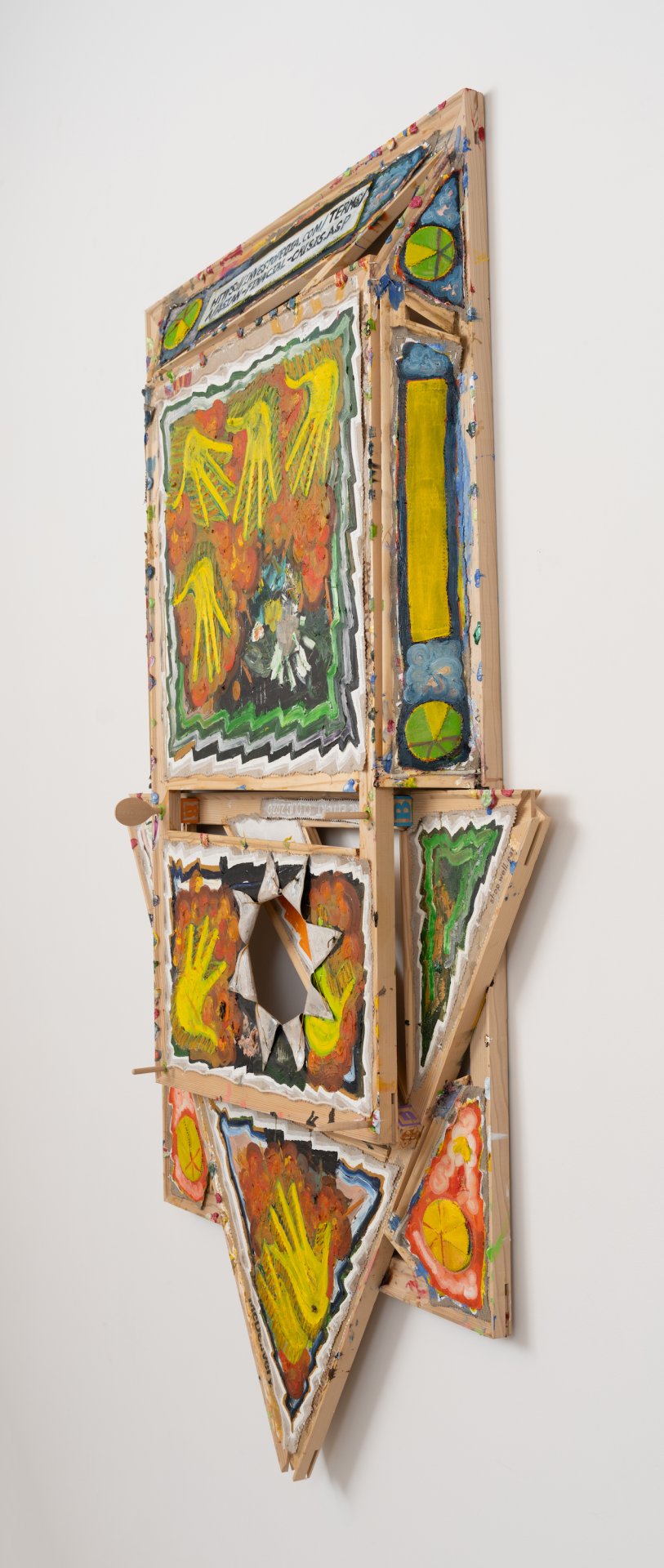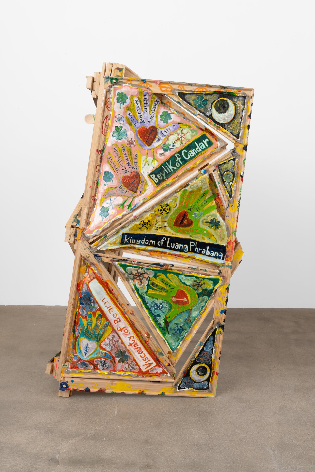 Mike Cloud (b. 1974) is a Chicago-based artist whose complex and vibrant paintings often utilize conventional support materials organized in unconventional ways. Stretcher bars, normally brought together at perpendicular angles, are instead conjoined into star or diamond shapes, one sometimes crossing in front of another like a highway offramp; canvas may be affixed to the front of the bar, rather than stretched around it, and thin strips of canvas might cross the field like streamers or banners. Are Cloud’s paintings abstract? This is a complicated question to address. Are they representational? Yes, they represent specific and concrete things in the world – people, places, objects. Do they represent these things through visual likeness? Not so much. Instead, Cloud invokes other forms of semiosis, producing meanings through a variety of means – written language, linguistic permutations, website urls, hieroglyphs, pictograms, and other symbolic imagery such as hand-birds. Again, are they abstract? Yes, Cloud’s paintings are abstract in the sense that they condense vast amounts of information into a limited space. In the new works presented in Circle Chat, Cloud has included two canvases that utilize hinges to fold into floor sculptures, one hinged horizontally like a construction site sign (“Oyster Oil”), the other hinged vertically, sitting on the floor like a scrim (“Kingdom of Luang Phrabang”). Highly specific, yet mysterious and spring-loaded, these virtuosic, operatic works are ultimately meditations on the fundaments of painting – color, facture, form, speed – and the relationship between the act of interpretation and being in the world.